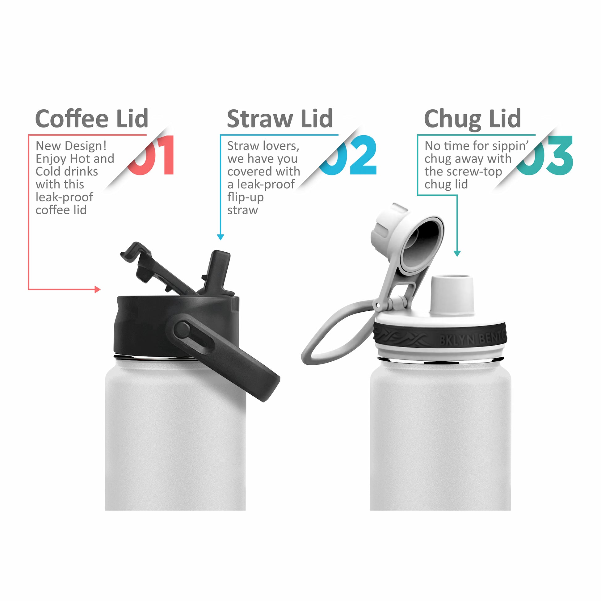 Bklyn Bento Wide-Mouth Vacuum Insulated Water Bottle Comes With All 3 Lid Options: (1) Chug (2) Straw and (3) Coffee Lid (White / 24oz)