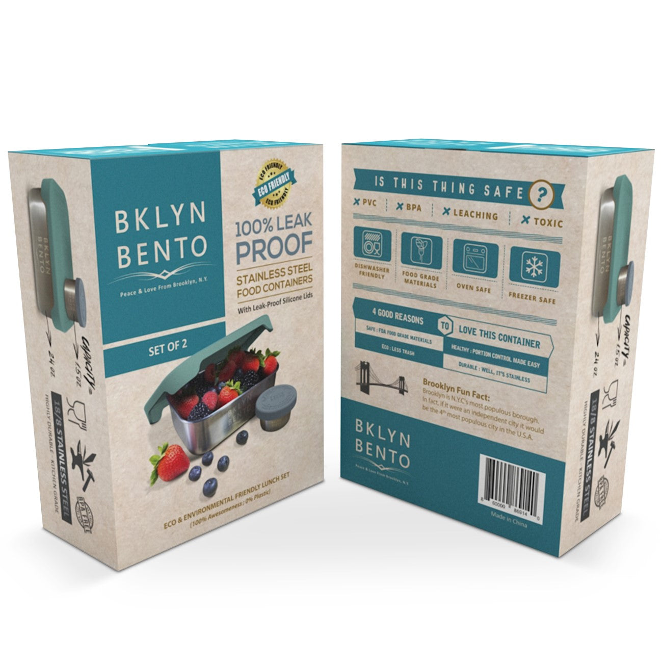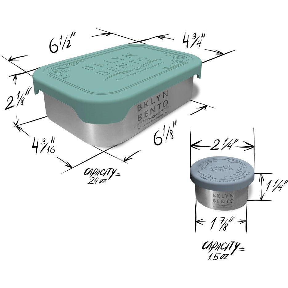 Bklyn Bento 2 Piece Set, Stainless Steel Metal Lunch Box + Condiment Container with Leakproof Lids (Green)